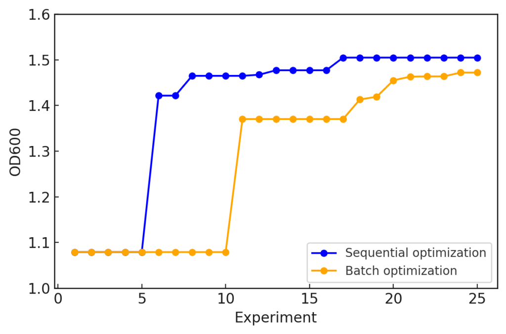 ただし、現実の研究では「1回の培養に1ヶ月かかる」といった状況もあり、その場合は1バッチでの逐次最適化は非現実的です。実験効率を考慮すると、バッチ最適化が実務的には有用になります。つまり、探索精度と実験効率のトレードオフが存在します。