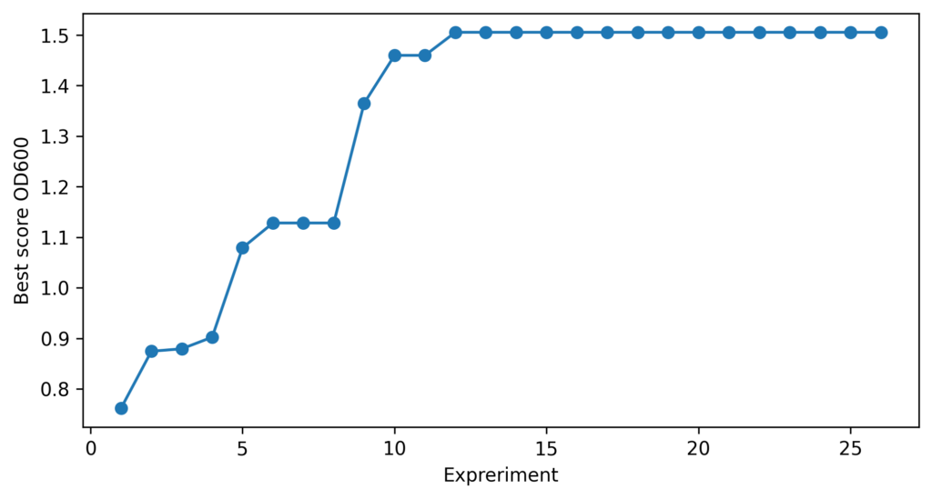 n_itersはモデルによる条件提案とその評価を行うプロセスは何回行うかに対応しています。今回はin silicoなので無限にできますが、現実では予算によって制約される値です。