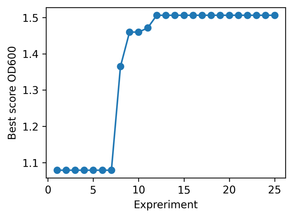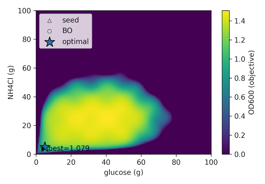 "best_so_far": best_od, "best_x": best_xy[0], "best_y": best_xy[1]})ODObjective2Dは細胞くんの挙動を表す関数です(OD を出力です)。今回では、モデルが提案した条件の結果を評価するために、このモデルを利用します。注意点としては、実運用では関数は準備できないので、このプロセスはスキップして、実測値を入力すればいいです。